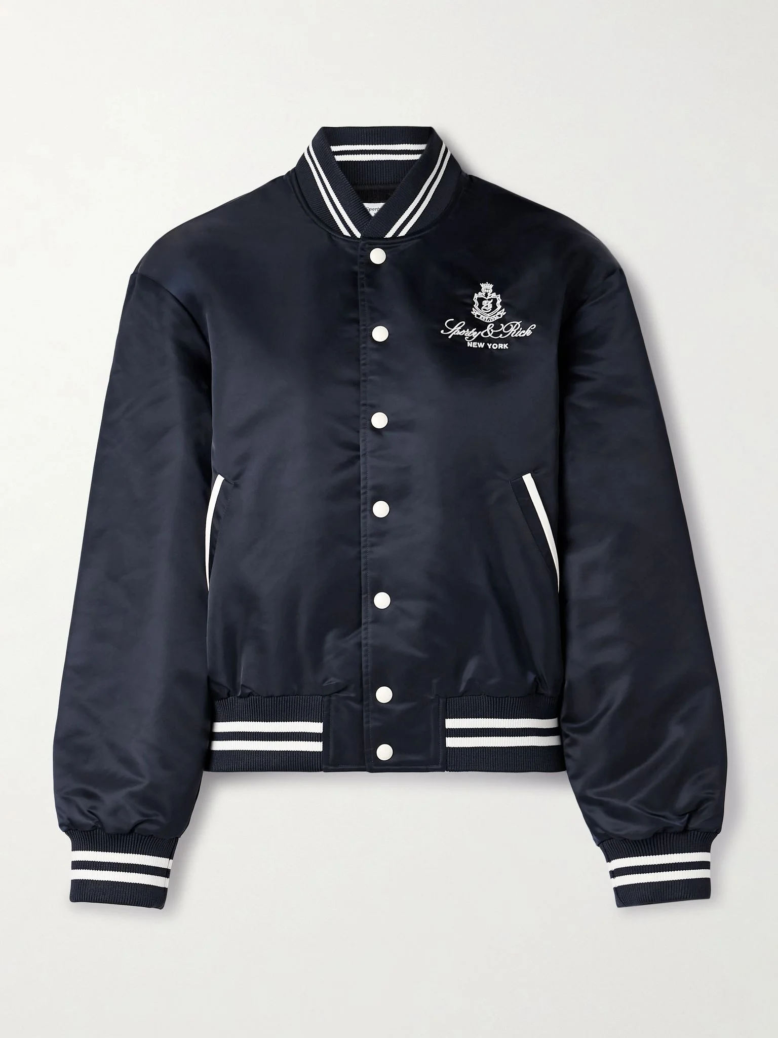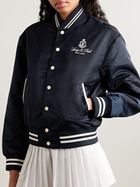Sporty & Rich's bomber jacket is modeled after vintage varsity styles. Cut from navy shell, it's traced with sporty striped trims and embroidered with the brand's logo crest at the chest and back. Wear yours with the coordinating track pants in our edit. Size & Fit - Fits true to size, take your normal size - Intended for a loose fit - Ribbed hem - Mid-weight, non-stretchy fabric - Model is 175cm/ 5'9" and is wearing a size Small Details & Care - Navy shell - Snap fastenings through front - 100% polyamide; trim: 99% polyester, 1% elastane; lining: 52% polyester, 48% viscose - Fully lined - Hand wash
