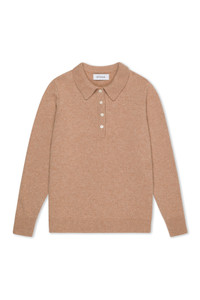 The Cashmere Polo Sweater, a timeless staple reimagined in ultra-soft, luxurious Mongolian yarn. Designed with a relaxed silhouette, this sweater features a refined polo collar with a three-button placket and ribbed trims for a clean finish. This is the perfect transitional piece for layering or wearing solo. COLOR: Almondine FIT & MEASUREMENTS - Fits true to size; relaxed fit - Emma is 5'10" & wears size Small PRODUCT DETAILS - 100% Cashmere - Sustainably grown, organic yarn - Polo-style collar with tonal button placket - Long sleeves with ribbed cuffs - Ribbed hemline - Dry clean only