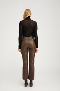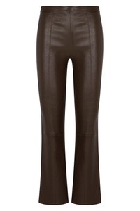 Made in our signature stretchy plonge leather, our Ankle Flare Pants with Princess Seams are buttery soft and feel like a second-skin. These pants feature a high rise and slim fit that flare subtly flare out at the ankle, with princess seams down the front and back for an ultra slimming and elongated look. Wear them with loafers and a cashmere sweater, or dress them up with heels. COLOR: Americano FIT & MEASUREMENTS - Fits true to size - Meant to fit tight at first-try – leather naturally gives; if in between sizes, size down - High-rise, slim fit - 28.5" inseam - Emma is 5'10" & wears size Small PRODUCT DETAILS - 100% French Lambskin - Stretch Leather - Cotton-Lycra lining - Elastic waistband, pull-on fit - Eco friendly, hypoallergenic and chrome-free vegetal dyed - Leather specialist clean only