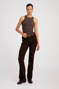 Our 5 Pocket Micro Flare suede pants made in our signature buttery soft, stretch-leather, are timeless and versatile. This high-waisted, slim fit flares subtly past the ankles for an ultra-flattering fit that elongates the leg, and is always in style. COLOR: Americano FIT & MEASUREMENTS - Runs large - size down - Our lambskin gives naturally over time; if in-between sizes, size down - High rise - 34" inseam, 10.5" rise - Toma wears size Small PRODUCT DETAILS - 100% French Lambskin - Stretch Leather - Cotton-Lycra lining - Eco friendly, hypoallergenic and chrome-free vegetal dyed - 5 functional pockets - Button front, zipper fly - Leather specialist clean only