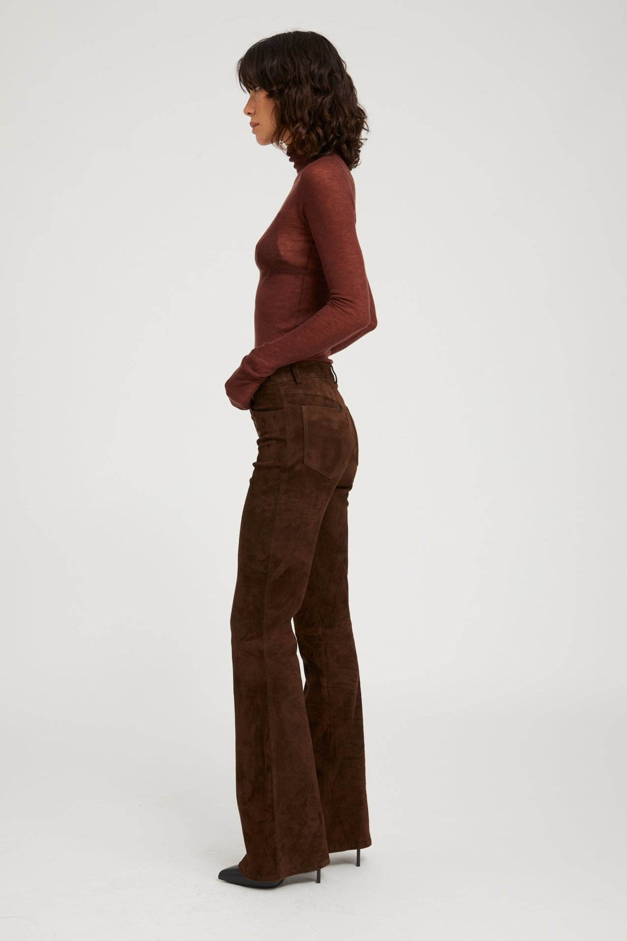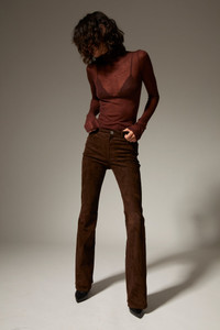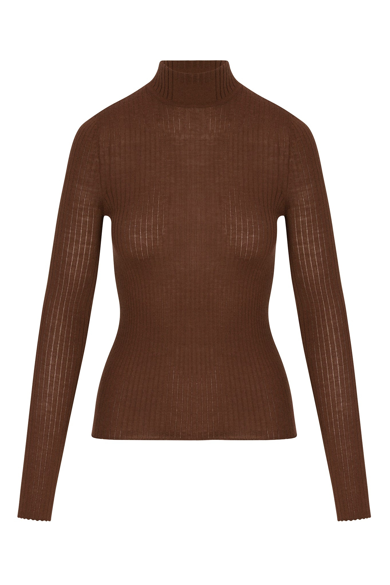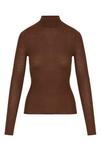 Knitted from our ultra-soft Mongolian yarn, this lightweight long sleeve essential is made from our featherweight Tissue Cashmere, which enhances its elegant drape and flattering silhouette. Designed with playful lettuce hemlines, this vertical ribbed mock-neck has just the right amount of stretch, and is slightly fitted for a slimming look. With a wide range of styling options, this top tucks seamlessly into all of your high waisted bottoms making it the perfect layering piece to pair with your favorite SPRWMN jeans or trousers. COLOR: Americano FIT & MEASUREMENTS - Fits true to size - Emma is 5'10" & wears size Small PRODUCT DETAILS - 100% Cashmere - Sustainably grown, organic yarn - Ultra lightweight - Room for layering - Dry clean only