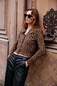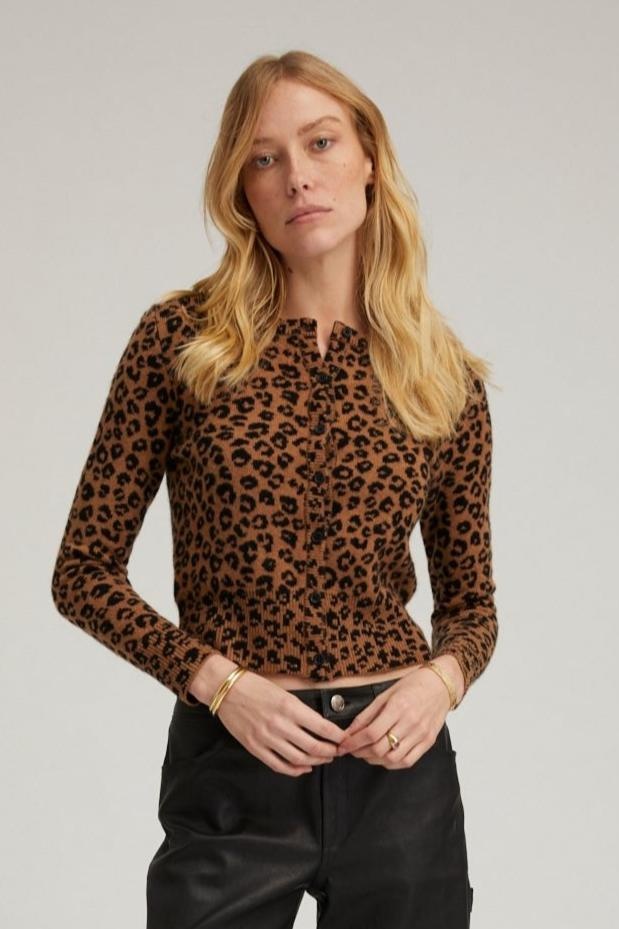 Knitted in our high quality, ultra-soft Mongolian Cashmere, this timeless baby cardigan will become your new everyday go-to. Designed for a slightly fitted look that hits at the natural waistline, wear this sweater buttoned up or undone over a classic baby tee. COLOR: Leopard FIT & MEASUREMENTS - Fits true to size - Designed for a fitted look - Lauren wears size Small PRODUCT DETAILS - 100% Cashmere - Sustainably grown, organic yarn - 7 front button closure - Dry clean only