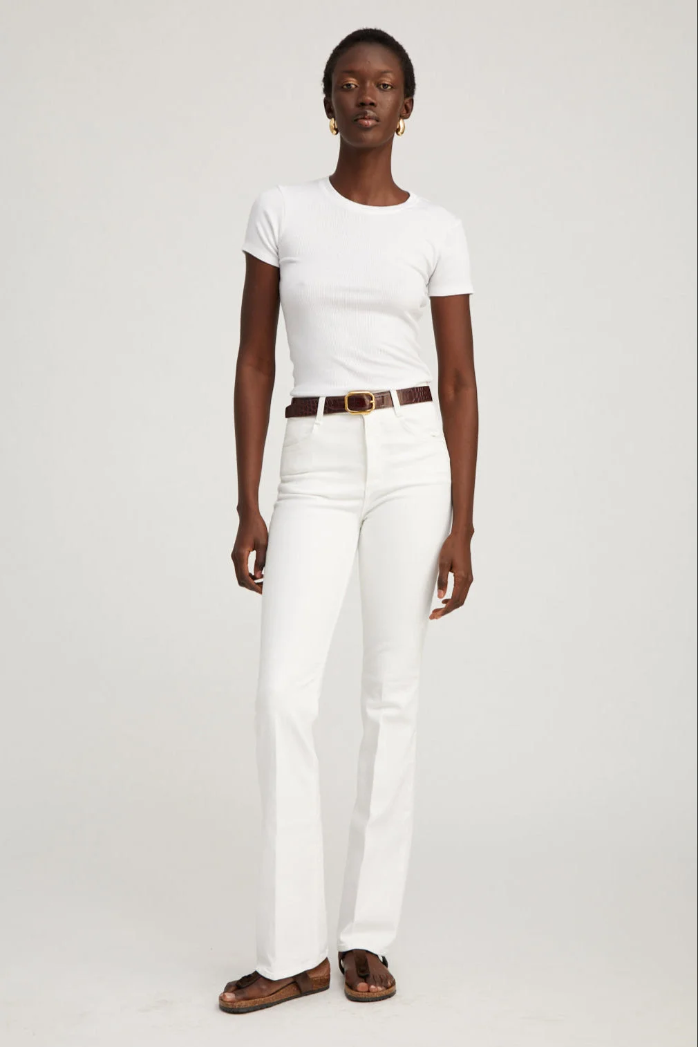 A timeless and versatile silhouette, our signature Micro Flare jeans feature a high rise with a slim fit and a narrow flare that extends past the ankle to elongate the legs. Made from stretch denim that conforms to your body and won't loose it's shape overtime, these pants will quickly become your favorite pair of jeans. Featuring our signature V-back belt loops and faux croc embossed label for a chic detail that accentuates your natural waist, wear these with a classic baby tee and sneakers or a button down and heels. WASH: Billie - Optic White FIT & MEASUREMENTS - Fits true to size - High-rise - 35" inseam, 11.5" rise, 18.5" leg opening - Adama is 5'11 & wears size 26 PRODUCT DETAILS - 98% Cotton, 2% Elastane - Stretch Denim - Italian Denim - Machine wash cold, tumble dry low - Front zipper & button closure