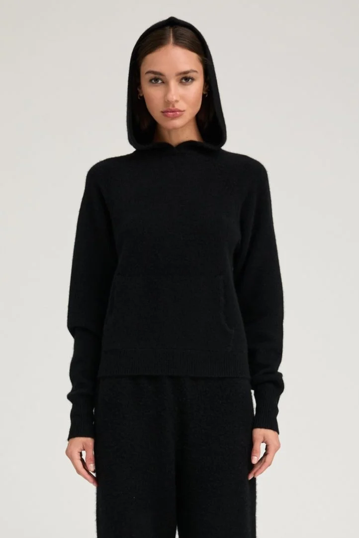 Designed in our brushed Mongolian cashmere, enjoy the cozy, ultrasoft feel and warmth of this classic hoodie, that's perfect for layering during the cold seasons. Fitted with a functional kangaroo pocket and hood for an effortless lounge look that's been upgraded. COLOR: Black FIT & MEASUREMENTS - Fits true to size - Designed for a fitted look - Anna is 5'11 & wears size Small PRODUCT DETAILS - 100% Cashmere - Sustainably grown, organic yarn - Kangaroo pocket - Dry clean only