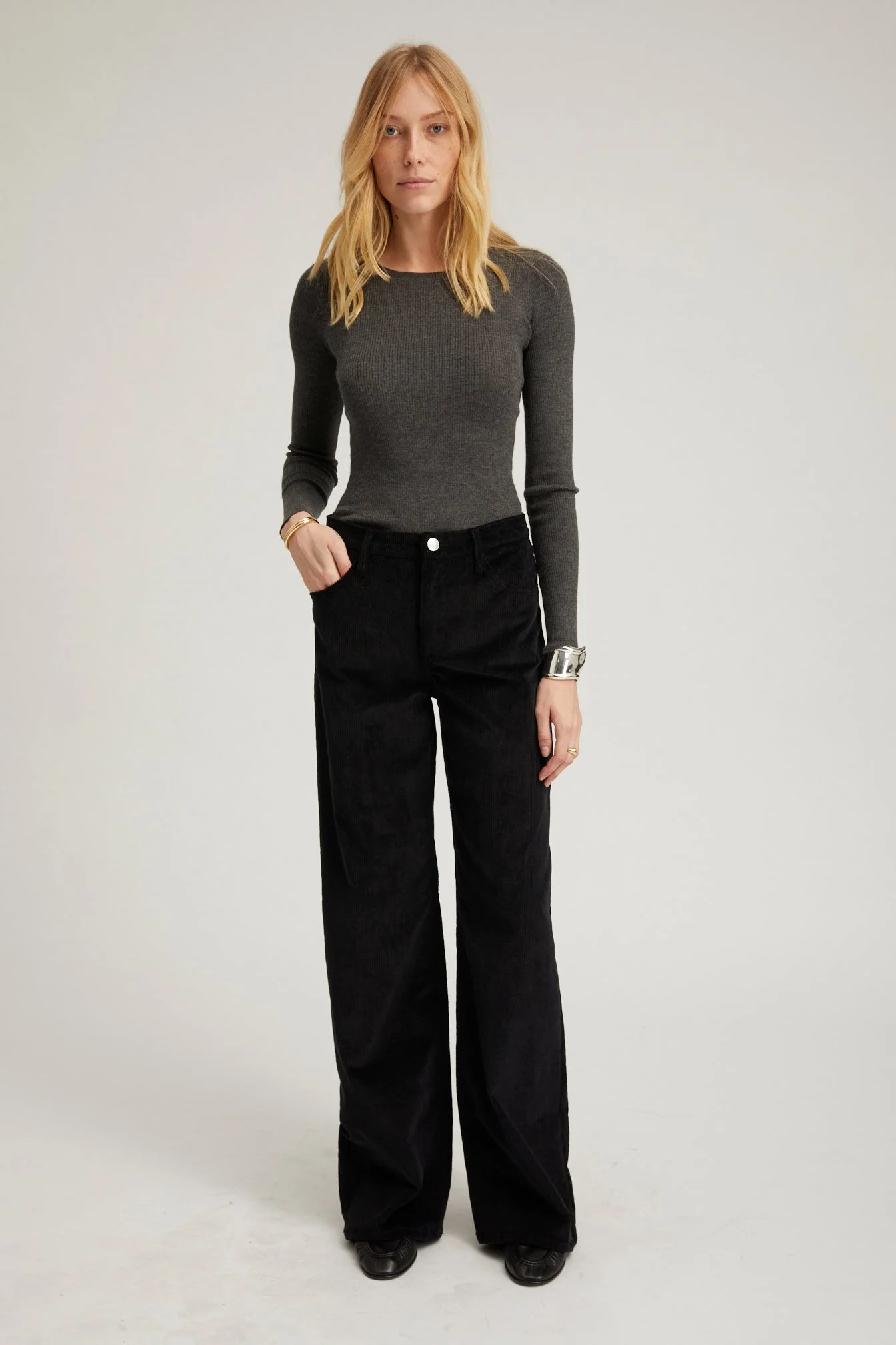 Designed in a soft yet sturdy wide-ridge corduroy - a classic material for Fall. Inspired by luxury vintage fits, this mid-rise, wide leg silhouette is designed to sit relaxed at the waist, hips, and thigh, for an effortlessly chic and laid-back look that elongates your figure. Pair these with a tank and leather blazer. COLOR: Black FIT & MEASUREMENTS - Oversized fit, for a tighter fit at the waist & hips - size down - 34" inseam, 11" rise, 22" leg opening - Model wears a size 26 PRODUCT DETAILS - 77% Cotton, 22%, Tencel, 1% Elastic - Button front, zipper fly - 5 functional pockets - Machine wash cold, tumble dry low