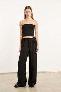 Made in a crisp and structured crepe material that will help keep you feeling cool and airy on any occasion. Featuring a comfortable, loose fit and designed with a stretchy elastic waistband to effortlessly pull on for easy wear. Slip on these on with one of our ribbed knit tees or a cozy cashmere sweater. COLOR: Black FIT & MEASUREMENTS - Mid-rise, wide fit - 32" inseam, 12" leg opening - The model wears a size Small PRODUCT DETAILS - 97% Viscose, 3% Elastane - Dry clean only - Unlined - No pockets