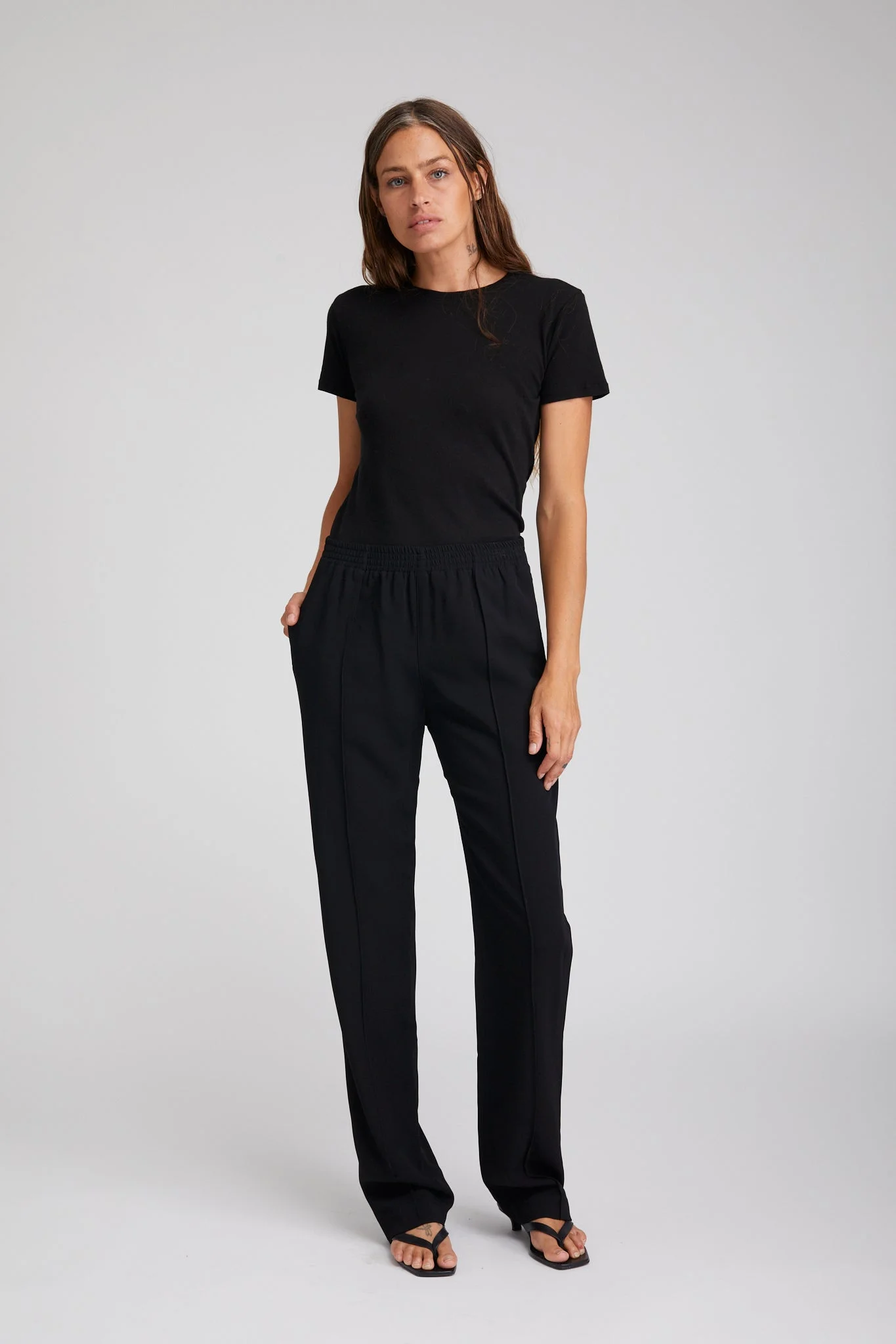 TheBlack Crepe Pintuck Trouser Joggers have a pull on fit and front pintuck details to help visually lengthen your legs. Wear these with a bodysuit or one of our classic tees for a smartly tailored outfit. COLOR:Black Crepe: 97% Viscose 3% Elastane Dry clean only Fit true to size 32" Inseam Model wears size Small FIT & MEASUREMENTS - Fit true to size - 32" Inseam - Model wears size Small PRODUCT DETAILS - Crepe: 97% Viscose 3% Elastane - Dry clean only