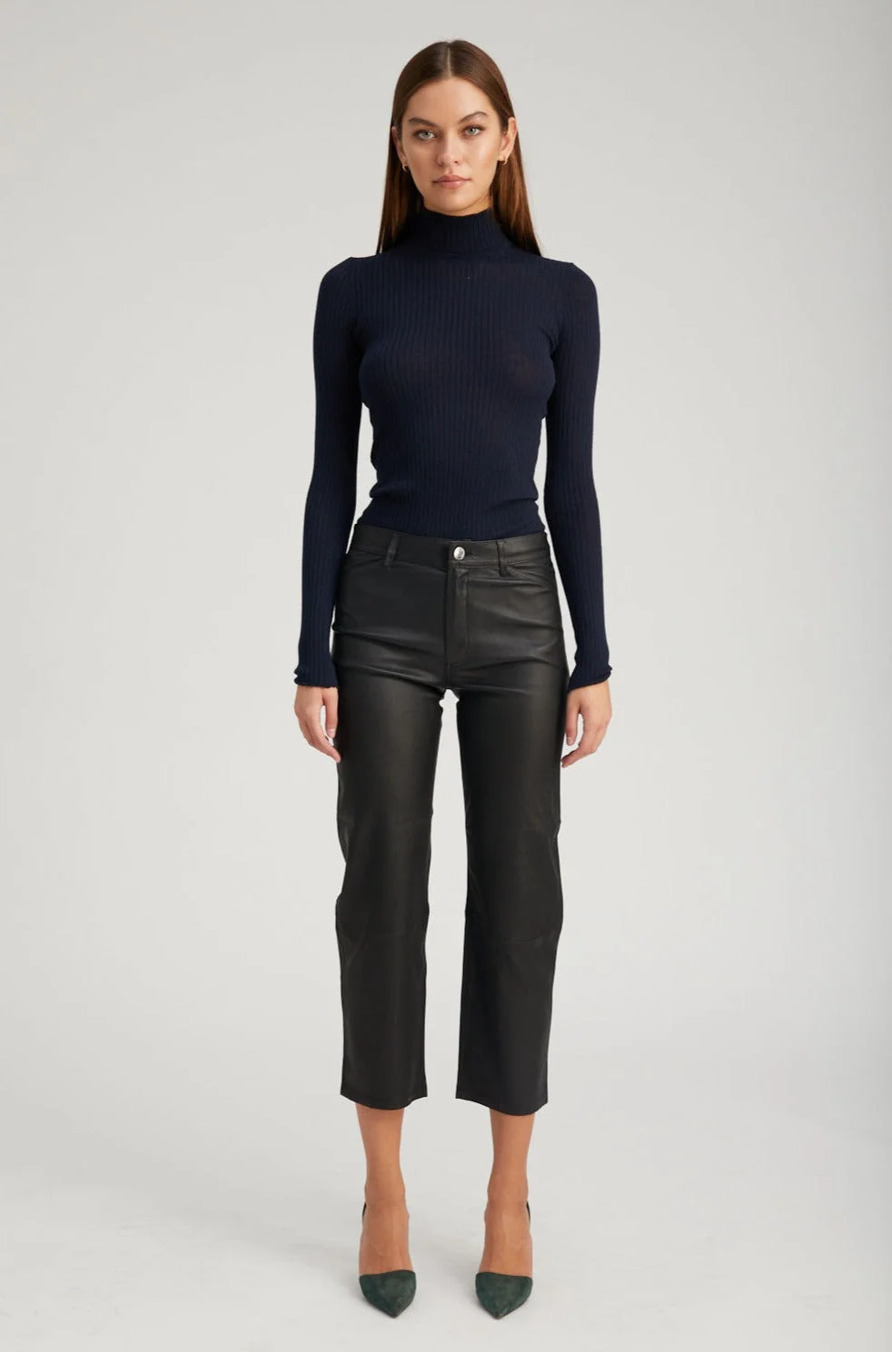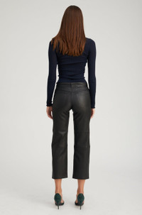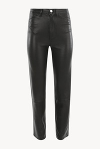 A luxurious take on a classic straight-leg fit made in our signature stretch-leather which areeffortlessly chic and easy to wear. Featuring functionalfive pockets, belt loops, and an-ultra sleek fit, these pants strike the perfect balance of modern and edgy. With a wide range of styling options these pair well with heeled boots or sneakers, a cable sweater or a blouse. COLOR: Black FIT & MEASUREMENTS - Fits true to size - Our lambskin gives naturally over time; if in-between sizes, size down - Relaxed, straight fit - 27" inseam, 11" rise, 7" leg opening - Kiana is 5'11 & wears size Small PRODUCT DETAILS - 100% French Lambskin - Stretch Leather - Cotton-Lycra lining - Eco friendly, hypoallergenic and chrome-free vegetal dyed - Button front, zipper fly - 5 functional pockets - Leather specialist clean only