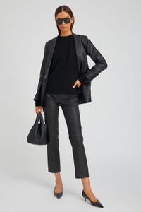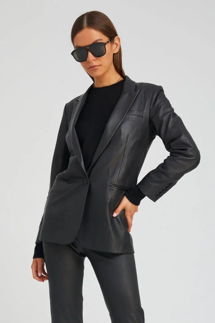 A classic,yet subtle statement maker, our black leather blazer’s slightly loose shape exudes a sense of ease. Tailored in a relaxed single-breasted silhouette, the black blazer is extremely versatile and pairs well with pretty much everything you have in your wardrobe. COLOR:Black FIT & MEASUREMENTS - Fits true to size - Model wears size Small PRODUCT DETAILS - 100% French Lambskin - Leather specialist clean only