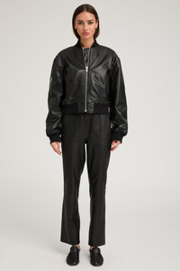 A classic bomber silhouette, made from ultra-soft, durable Agneau Plonge leather for a classic, structured look. Featuring a ribbed crew neckline, hem and cuffs and lined in smooth silk, this jacket is effortlessly chic yet has a laid-back look. COLOR: Black FIT & MEASUREMENTS - Fits true to size - Anna is 5'11 & wears size Small PRODUCT DETAILS - 100% French Lambskin - Silk lined - Eco friendly, hypoallergenic and chrome-free vegetal dyed - Ribbed neckline, hem and cuffs - Zip closure - Sleeve zipper pocket - Leather specialist clean only