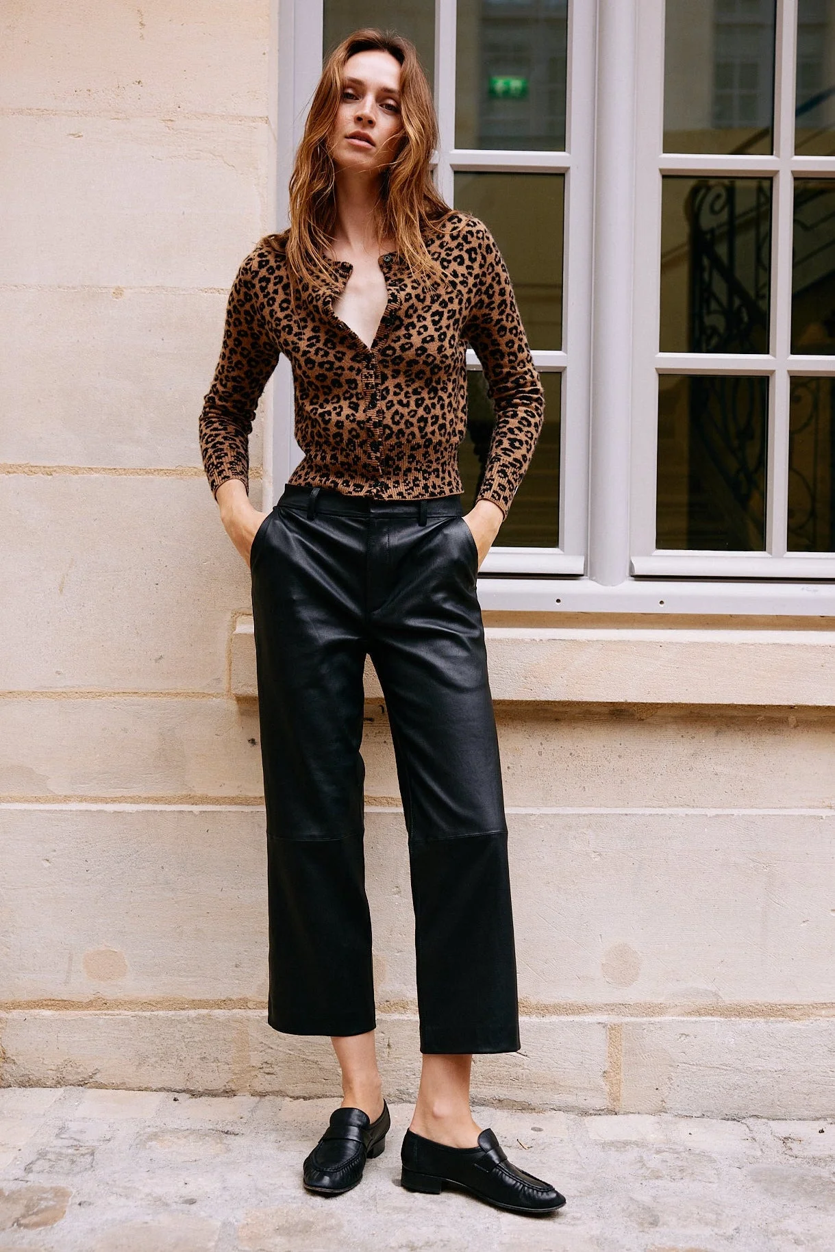 Our classic relaxed leather trouser silhouette - refined into a cropped fit. Designed with a comfortable low-risefit, functional pockets, and a zip closure with a snap button. This style is made to be worn slightlyoversized and can easily be worn casually with sneakersor dressed up with a heel. COLOR:Black FIT & MEASUREMENTS - Fits true to size - Mid-rise - Our lambskin gives naturally over time; if in-between sizes, size down - 26.5 inseam, 10 3/4" rise, 9 1/4" leg opening - Anna is 5'11 & wears size Small PRODUCT DETAILS - 100% French Lambskin - Stretch Leather - Cotton-Lycra lining - Eco friendly, hypoallergenic and chrome-free vegetal dyed - 2 back welt pockets - Button front, zipper fly - Leather specialist clean only