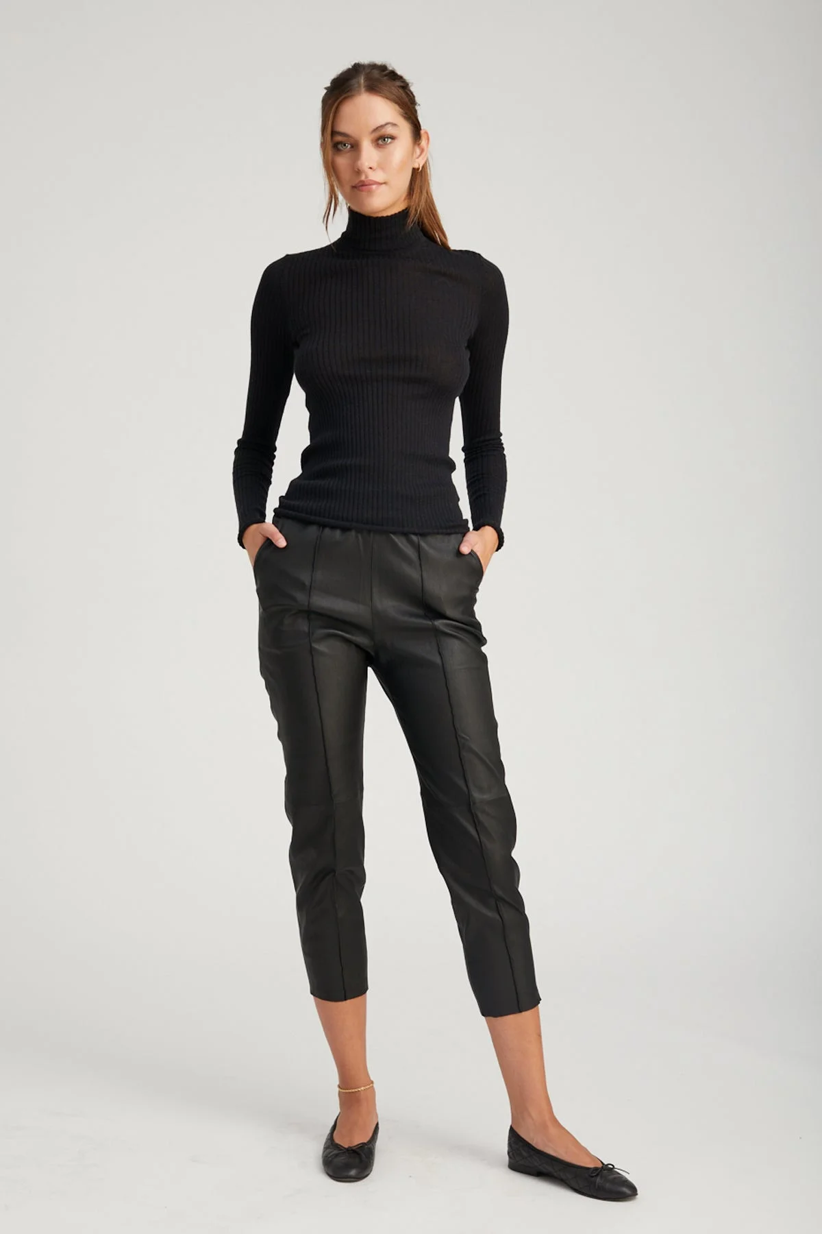 A luxurious take on a classic jogger, made in our signature stretch-leather are effortlessly chic and easy to wear. Designed for a relaxed fit with a comfortable elastic-stretch waistband and a raw hem. These pants are tailored with pintucks down the front and back to lengthen your legs. Wear these casually with sneakers and a tee, or take them out with a pair of heels. COLOR:Black FIT & MEASUREMENTS - Fits true to size - Our lambskin gives naturally over time; if in-between sizes, size down - 25.5" inseam, 11" rise - Kiana is 5'11 & wears size Small PRODUCT DETAILS - 100% French Lambskin - Stretch Leather - Cotton-Lycra lining - Elastic waistband, pull-on fit - Eco friendly, hypoallergenic and chrome-free vegetal dyed - 2 functional side pockets - Leather specialist clean only