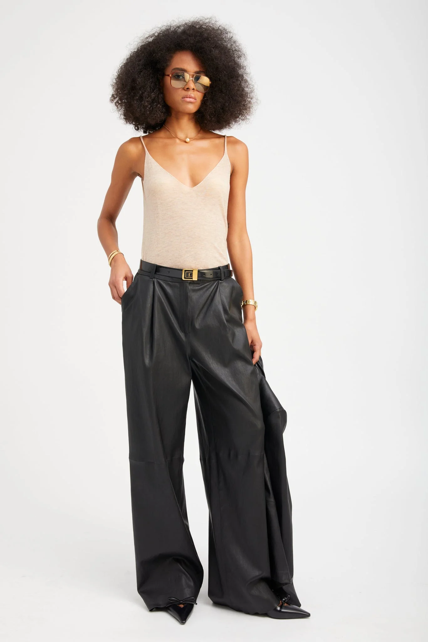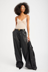 An indispensable addition to your capsule wardrobe, the Paloma Pleated Trousers are fashioned from our buttery-soft French plonge leather, offering an oversized, sophisticated drape and a silhouette that elongates the legs. The front features pleated detailing, that naturally tailors the waistline for a flattering, effortless fit. These trousers seamlessly transition from casual to formal settings—perfect with a tucked-in tee and sneakers or a blazer and heels. COLOR: Black FIT & MEASUREMENTS - Oversized fit, we recommend sizing down if a closer fit is preferred - Our lambskin gives naturally over time; if in-between sizes, size down - 34.5” inseam, 12.5” rise, 11” leg opening - Mika wears size Extra Small PRODUCT DETAILS - 100% French Lambskin - Stretch Leather - Cotton-Lycra lining - Eco friendly, hypoallergenic and chrome-free vegetal dyed - Zipper, hook and eye closure - Leather specialist clean only