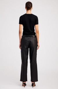 A luxurious take on your classic trouser, made in our buttery-soft, stretch-leather. Get ready for an effortlessly chic and easy to wear relaxed-fit that sits below the waist and hits at the ankle; featuring 2 functional pockets and a concealed zip for a sleek and timeless look. With a wide range of styling options, wear these casually with loafers and a cashmere sweater, or dressed up with heels and turtleneck. COLOR: Black FIT & MEASUREMENTS - Fits true to size - Relaxed fit - Our lambskin gives naturally over time; if in-between sizes, size down - Toma wears size Small PRODUCT DETAILS - 100% French Lambskin - Stretch Leather - Cotton-Lycra lining - Eco friendly, hypoallergenic and chrome-free vegetal dyed - Zipper, hook and eye closure - 2 back welt pockets - Leather specialist clean only