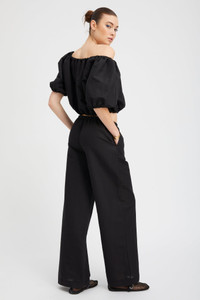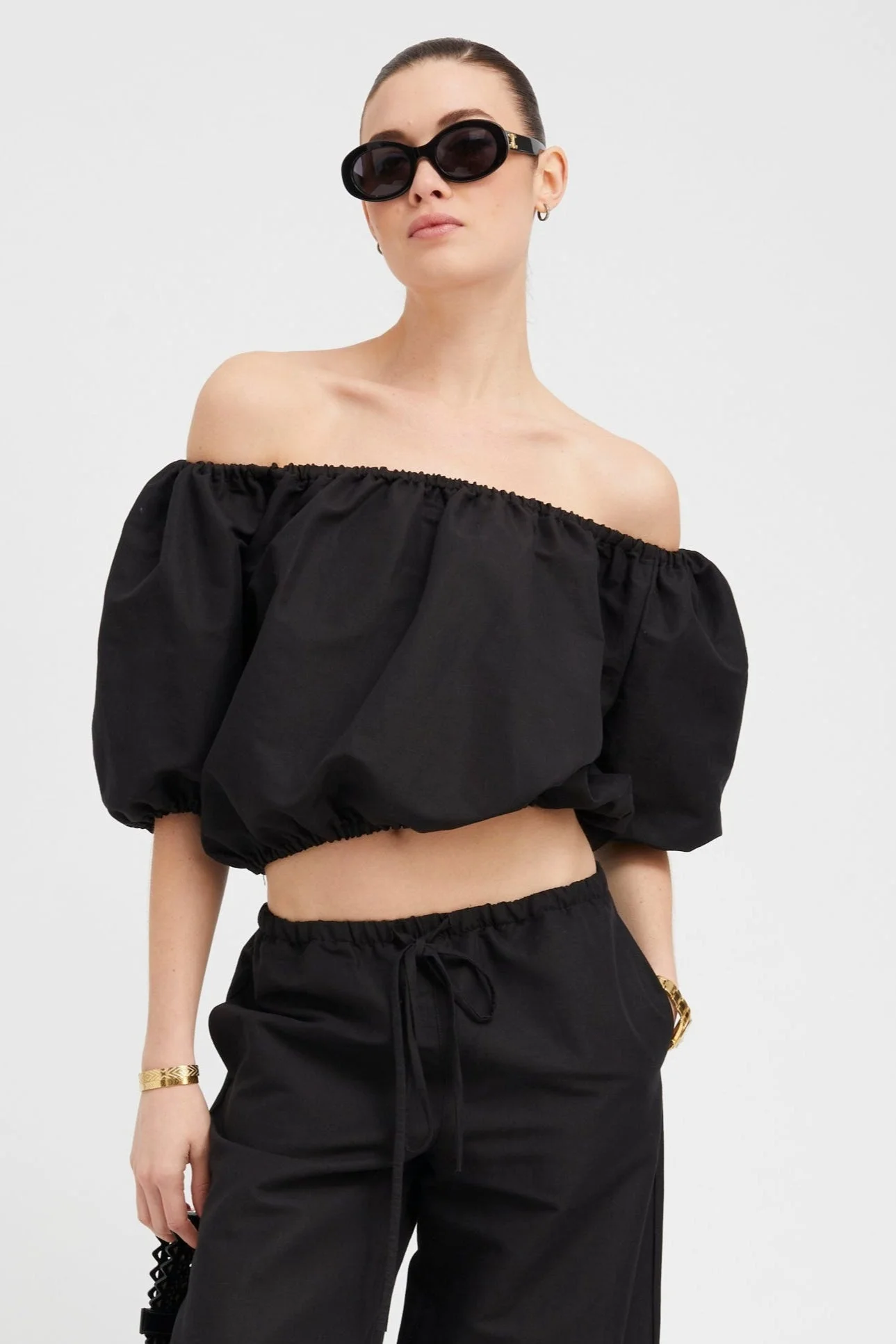 Our Isabel Top is made from ultra lightweight and breathable linen that will keep you feeling cool and airy all season long. Featuring an off the shoulder silhouette and puff sleeves, this is the perfect top to elevate any look, especially when paired with the matching drawstring pants. COLOR: Black FIT & MEASUREMENTS - Fits true to size - Kennedy is 5'11 & wears size Small PRODUCT DETAILS - 57% Linen, 43% Cotton - Machine wash cold, lay flat to dry