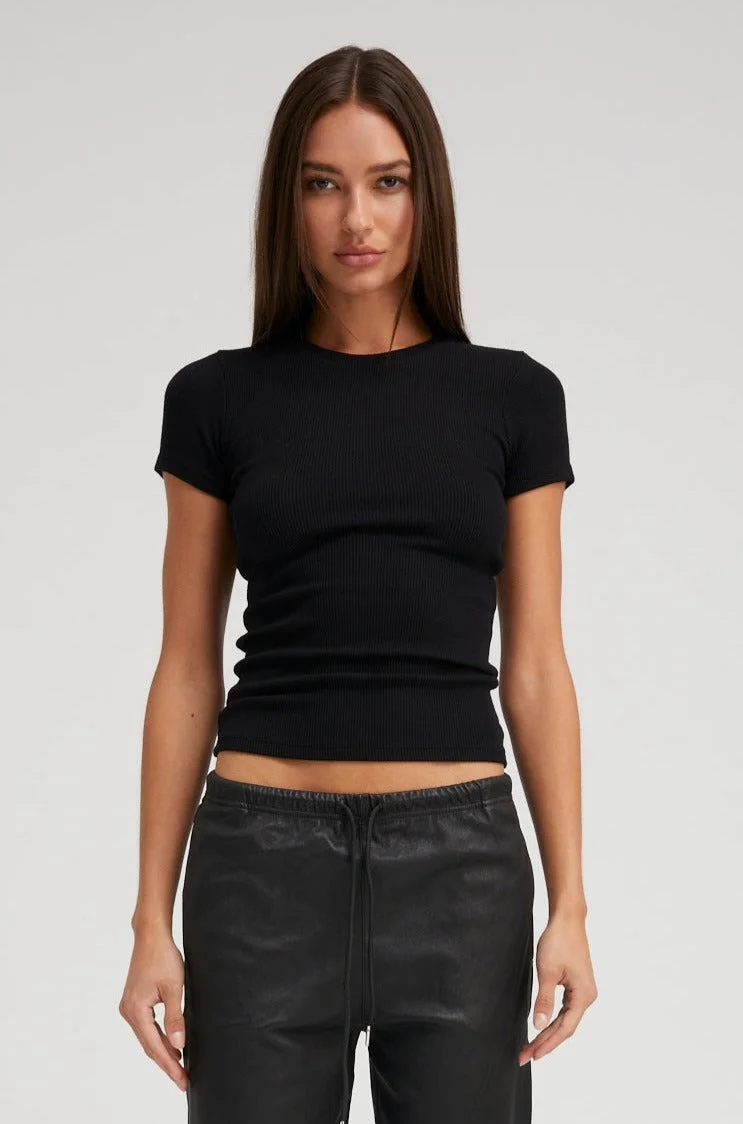 The perfect classic short sleeved crewneck t-shirt made in our breathable, ultra-stretchy, rib knit fabric that is wearable in any climate. Small horizontal ridges help to create a slimming and figure-hugging silhouette with a slightly tighter fit. Tuck it into your favorite jeans or wear it under thick leather layers. COLOR:Black FIT & MEASUREMENTS - Fits true to size - Designed for a slightly snug fit - Anna is 5'11 & wears size Extra Small PRODUCT DETAILS - 98% Tencel, 2% Spandex - Crewneck - Small horizontal ridges for a slimming effect - Machine wash cold, tumble dry low
