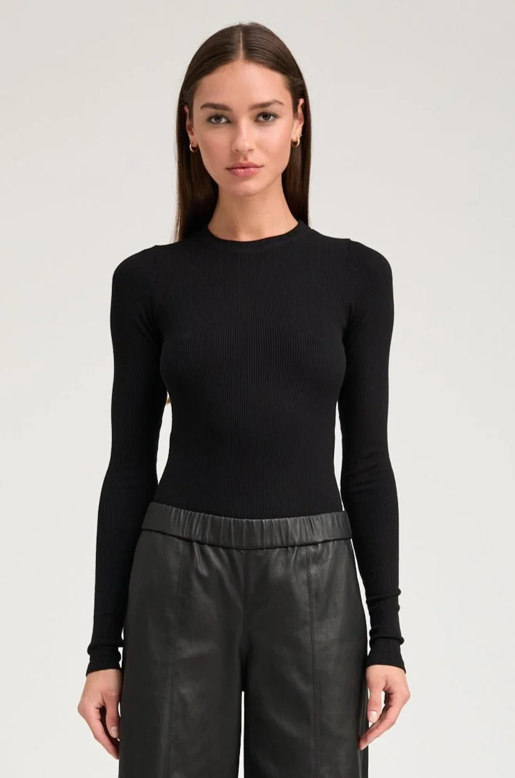 Every well-edited wardrobe requires a classic T-shirt and our Long Sleeve Baby Tee ticks all the right boxes. Made in our super soft ribbed fabric, this timeless knit is breathable and feels like second-skin on. This style has a crew neckline, long sleeves and is designed for a slightly snug fit. Pair it with your favorite jeans. COLOR:Black FIT & MEASUREMENTS - Fits true to size - Designed for a slightly snug fit - Adama & Kiana are 5'11 & wear size Small PRODUCT DETAILS - 98% Tencel, 2% Spandex - Small vertical ridges for a slimming effect - Machine wash cold, tumble dry low