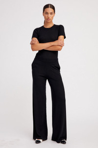 These fine-knit lightweight cashmere pants are a lounge favorite. This wide-leg silhouette features a high-rise elastic waistband that naturally cinches your waistline for a flattering fit you can wear all day long. Made in our high-quality, ultrasoft Mongolian yarn, you'll fall in love with these pants, as their elegant drape makes them look like a dress pant, but they feel like a sweatpant. Pair them with our matching cashmere tees or sweaters for the perfect elevated lounge look. COLOR: Black FIT & MEASUREMENTS - Relaxed fit - Toma wears size Small PRODUCT DETAILS - 100% Cashmere - Sustainably grown, organic yarn - Side slit pockets - Pull-on fit - Elastic waistband - Dry clean only