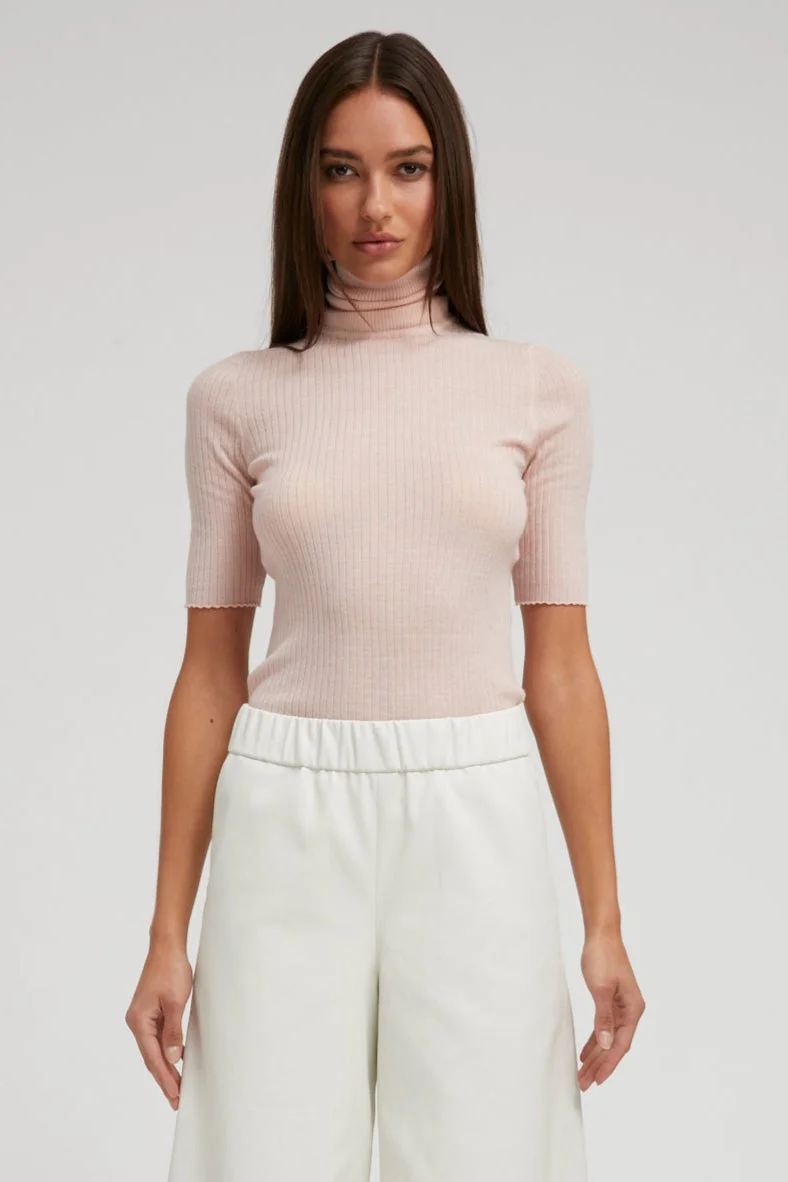 Finely knitted in our high quality, ultrasoft Mongolian Cashmere, this lightweight turtleneck is the in-between layering piece your wardrobe needs. Elegantly designed with 3/4 length sleeves and playful lettuce hemlines, this vertical rib-knit has just the right amount of stretch and is slightly fitted for a slimming look. With a wide range of styling options, this top tucks seamlessly into all of your high waisted bottoms— pair with your favorite SPRWMN jeans or a classic leather skirt. COLOR: Blush FIT & MEASUREMENTS - Fits true to size - Anna is 5'11 & wears size Small PRODUCT DETAILS - 100% Cashmere - Sustainably grown, organic yarn - Turtleneck - Lettuce Hemlines - Dry clean only