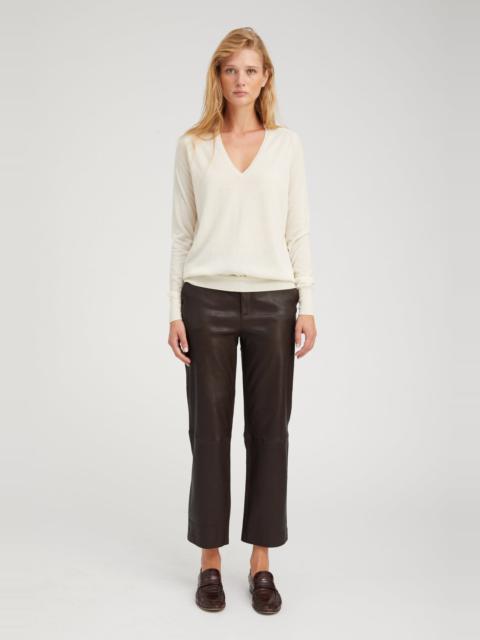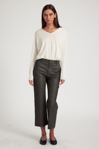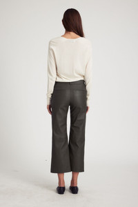 A luxurious cropped take on our classic trouser, made in our buttery-soft, stretch-leather. An effortlessly chic and easy to wear relaxed-fit that sits below the waist; featuring 2 functional pockets and a concealed zip for a sleek and timeless look. With a wide range of styling options, wear these casually with loafers and a cashmere sweater, or dressed up with heels and a turtleneck. COLOR: Cactus FIT & MEASUREMENTS - Fits true to size - Mid-rise - Our lambskin gives naturally over time; if in-between sizes, size down - 26.5" inseam, 10 3/4" rise, 9 1/4" leg opening - Kiana is 5'11 & wears size Small PRODUCT DETAILS - 100% French Lambskin - Stretch Leather - Cotton-Lycra lining - Eco friendly, hypoallergenic and chrome-free vegetal dyed - Button front, zipper fly - 2 back welt pockets - Leather specialist clean only