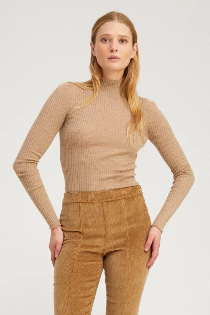 Finely knitted in our high quality, ultra-soft Mongolian Cashmere, this lightweight long sleeve essential will easily become a wardrobe favorite. Elegantly designed with playful lettuce hemlines, this vertical ribbed mock-neck has just the right amount of stretch, and is slightly fitted for a slimming look. With a wide range of styling options, this top tucks seamlessly into all of your high waisted bottoms making it the perfect layering piece to pair with your favorite SPRWMN jeans or trousers. COLOR:Camel FIT & MEASUREMENTS - Fits true to size - Model wears a size small PRODUCT DETAILS - 100% Cashmere - Sustainably grown, organic yarn - Mock neck - Dry clean only