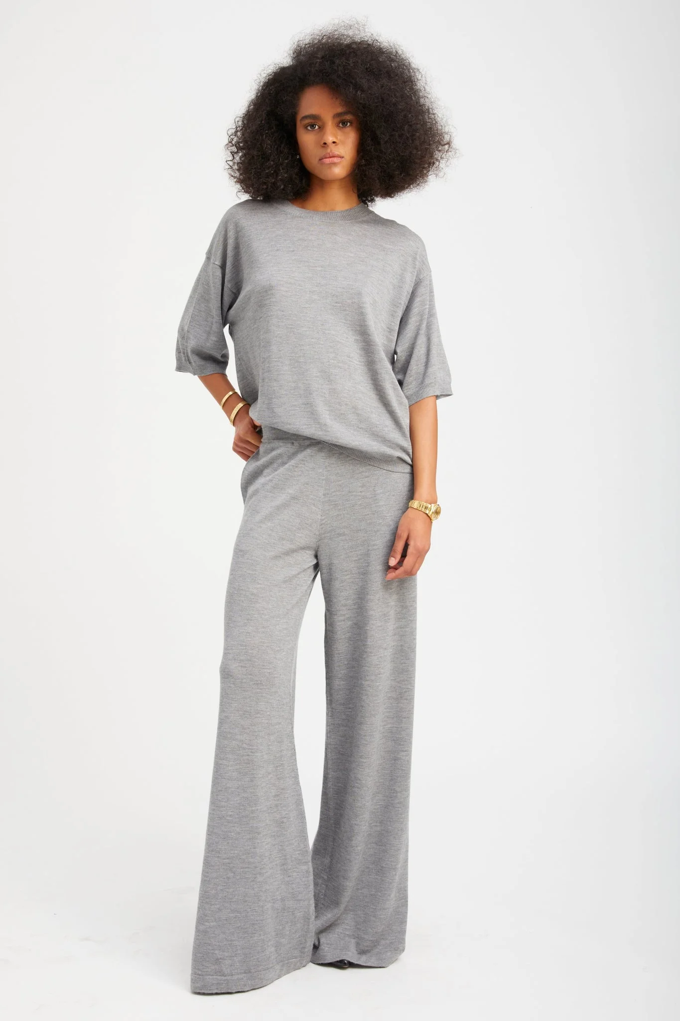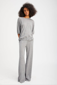 These fine-knit lightweight cashmere pants are a lounge favorite. This wide-leg silhouette features a high-rise elastic waistband that naturally cinches your waistline for a flattering fit you can wear all day long. Made in our high-quality, ultrasoft Mongolian yarn, you'll fall in love with these pants, as their elegant drape makes them look like a dress pant, but they feel like a sweatpant. Pair them with our matching cashmere tees or sweaters for the perfect elevated lounge look. COLOR: Grey FIT & MEASUREMENTS - Fits true to size; relaxed fit - 34.5" inseam, 12.5" rise - Mika wears size Small PRODUCT DETAILS - 100% Cashmere - Sustainably grown, organic yarn - 7gg - Side slit pockets - Pull-on fit - Elastic waistband - Dry clean only