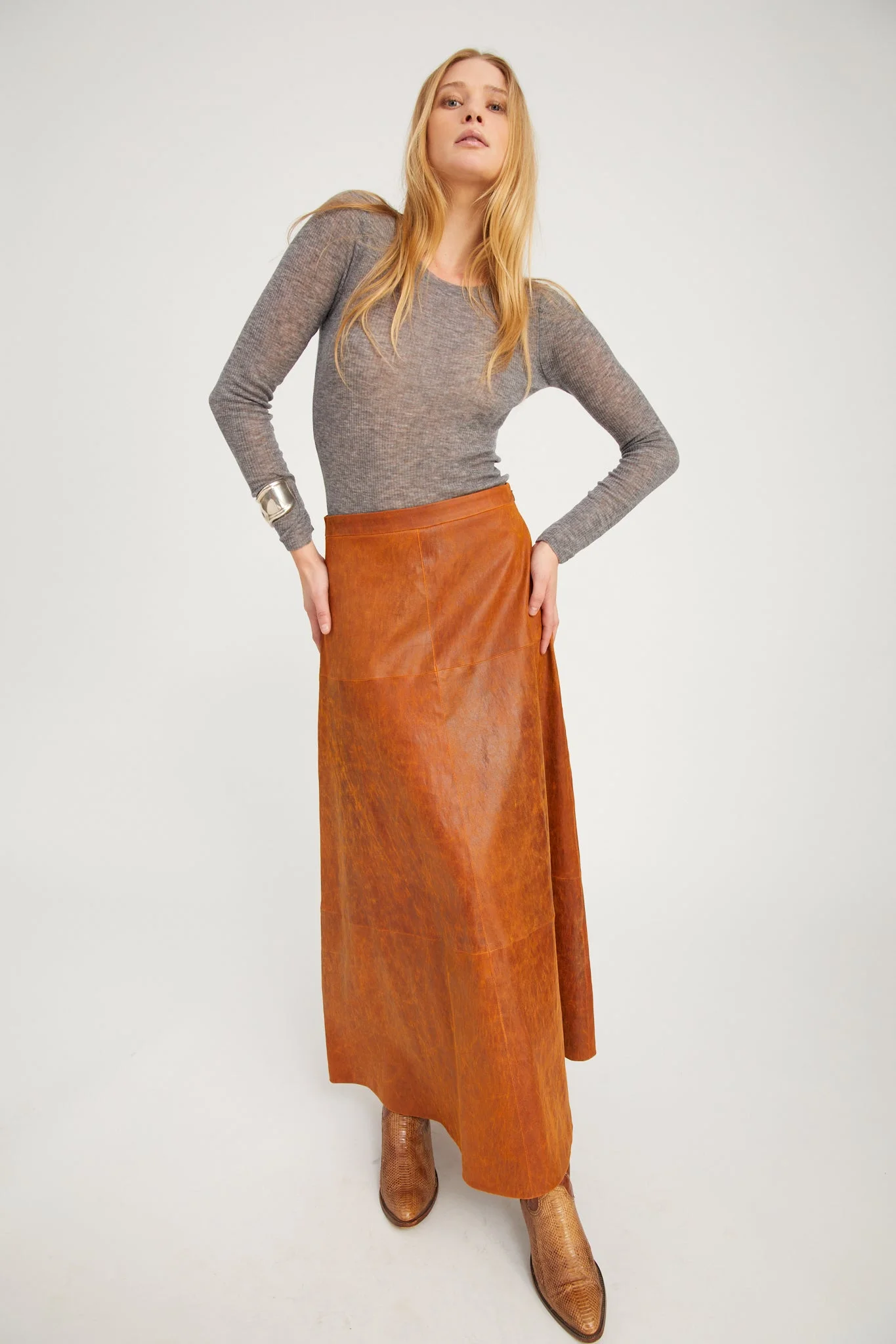 Sleek, structured and sophisticated - the Julia skirt is a timeless wardrobe staple. Crafted from our ultra-soft, Plonge leather, it features clean paneling and a flattering A-line, high-waisted silhouette. Style with a slim knit top and heels for an ultra-chic look. COLOR: Cedar FIT & MEASUREMENTS - Fits true to size - Emma is 5'10" & wears size Small PRODUCT DETAILS - 100% French Lambskin - Stretch Leather - Cotton-Lycra lining - Eco friendly, hypoallergenic and chrome-free vegetal dyed - High waisted, A-line silhouette - Full-length hem - Invisible back zipper