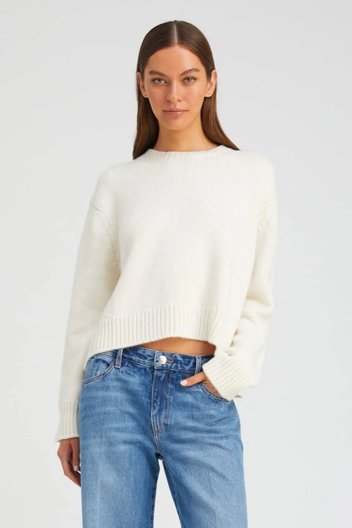 This luxe cashmere crewneck has a relaxed fit for the most elegant drape. Made from our high quality Mongolian yarn, this thick, double-weight fabric is ultra-soft and will keep you warm no matter what. With roomy shoulders and a hem that hits below your natural waist, it's the go-to sweater for both, casual and dressy looks. COLOR: Chalk FIT & MEASUREMENTS - Fits true to size - Cropped fit - Lauren wears size Small PRODUCT DETAILS - 100% Cashmere - 3 gg - Sustainably grown, organic yarn - Dry clean only