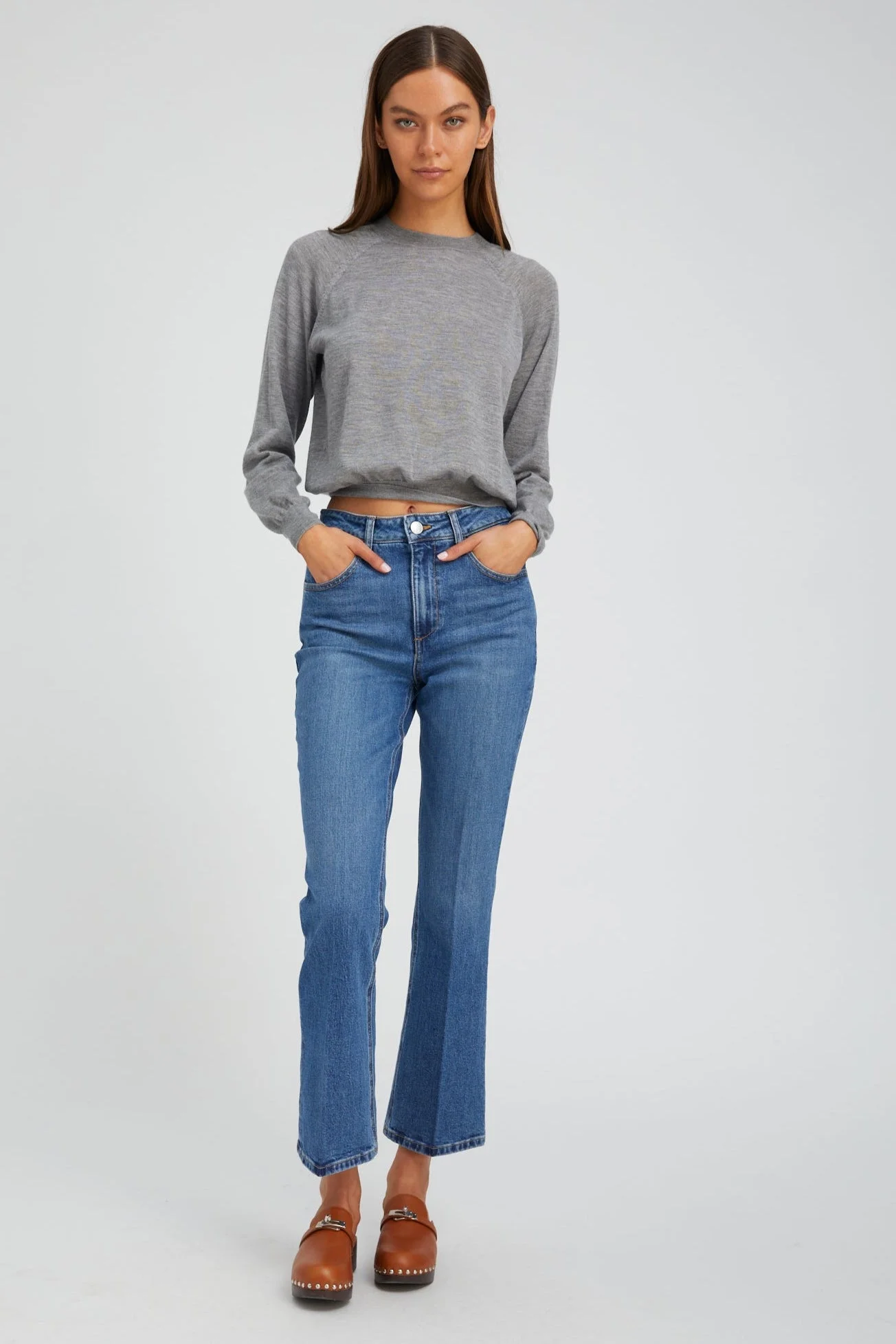 This classic ankle flare style is designed to sit at the natural waist, and flare slightly at the ankle to elongate the legs. Made from stretch denim that conforms to your body and won't loose it's shape overtime, these pants will quickly become your favorite pair of jeans. Featuring our signature V-back belt loops and faux croc embossed label for a chic detail that accentuates your natural waist. Style these with a baby tee and sneakers or a sweater and heels. WASH: Charlotte - Medium Blue with Fading FIT & MEASUREMENTS - Fits true to size - 28" inseam, 11" rise, 17" leg opening - Cindy is 5'9 & wears size 26 PRODUCT DETAILS - 98% Cotton 2% Elastane - Stretch Denim - Italian Denim - Machine wash cold, tumble dry low - Front zipper & button closure