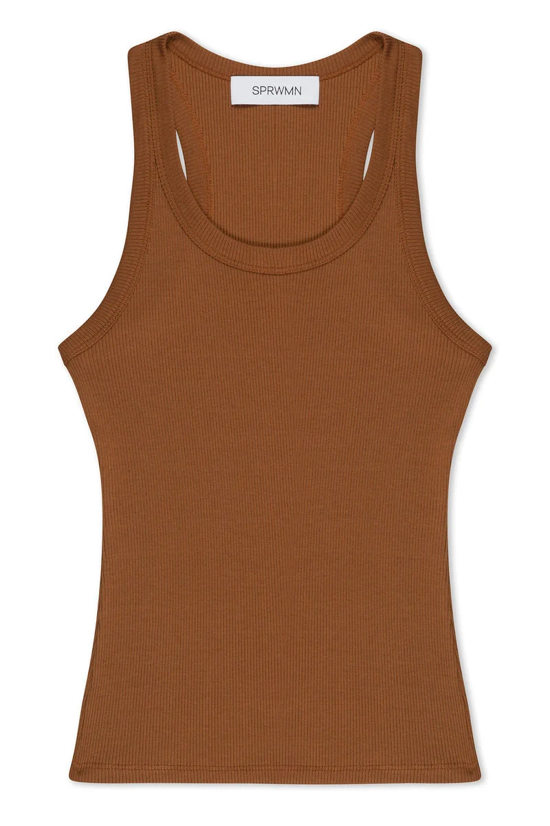 Made in our signature, soft ribbed fabric with resilient stretch, this naturally slimming scooped tank maintains its shape making it an everlasting wardrobe essential. Cut with a classic scoop neckline with thick straps and a racer back, it's fitted silhouette makes it versatile for day to night wear. COLOR: Chestnut FIT & MEASUREMENTS - Fits true to size - Designed for a slightly snug fit PRODUCT DETAILS - 98% Tencel, 2% Spandex - Small vertical ridges for a slimming effect - Machine wash cold, tumble dry low