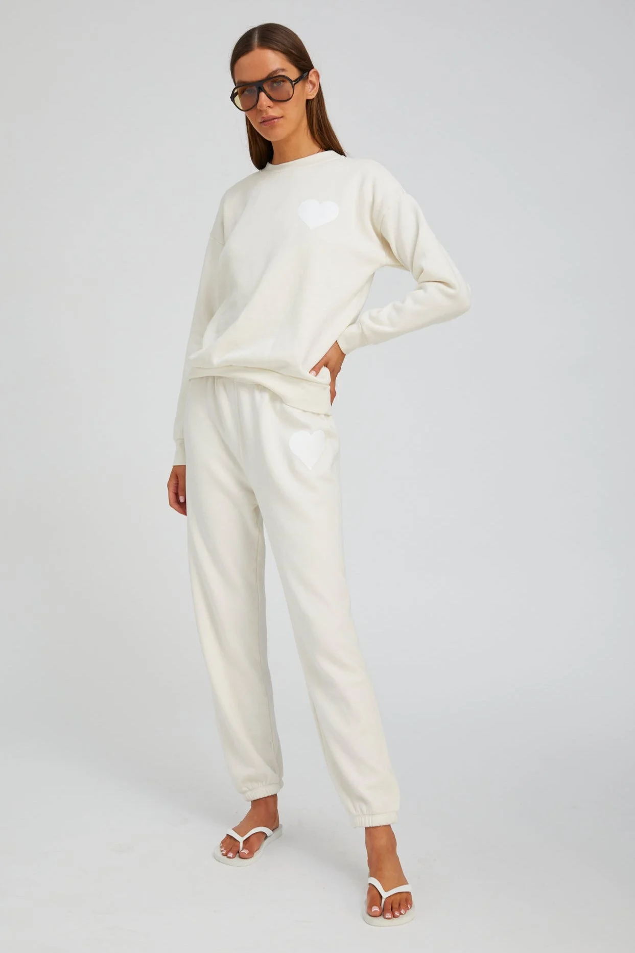 Back by popular demand is our signature heart joggers; an easy pull-on style, subtly printed with our heart logo. Renowned for their extremely soft, yet lightweight fabric, these sweatpants feature a cozy and effortless feel. For the perfect outfit, complete the look with a matching sweatshirt. COLOR: Creme, White Heart FIT & MEASUREMENTS - Fits true to size - 29" inseam, 13" rise, 9" leg opening - Kiana is 5'11 & wears size Small PRODUCT DETAILS - 50% Polyester, 38% Cotton, 12% Rayon - Machine wash cold, tumble dry low