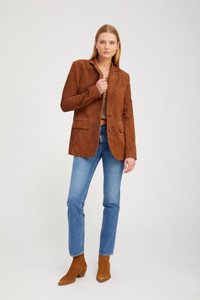 A classic, yet subtle statement maker, our classic suede blazer's relaxed shape exudes a sense of ease and sophistication. Made from our buttery-soft French plonge suede, this piece will feel like a second-skin due to its extreme breathability – a property exclusive to SPRWMN – making it wearable all year round. Tailored in a single breasted silhouette, this blazer is extremely versatile and pairs well with everything from leather to denim. COLOR: Dark Cognac FIT & MEASUREMENTS - Fits true to size - Zippy wears size Small PRODUCT DETAILS - 100% French Lambskin - Stretch Leather - Cotton-Lycra lining - Eco friendly, hypoallergenic and chrome-free vegetal dyed - 2 front button closure - Leather specialist clean only