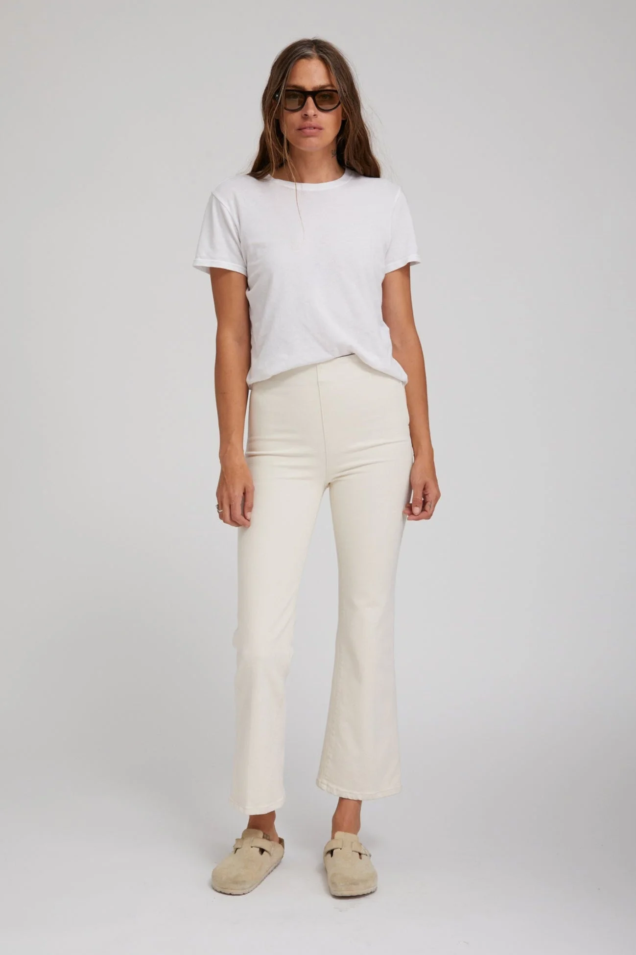 Introducing our denim crop flare leggings! In an off-white denim washfeaturing our signature elastic band with a zipper on the side. The look of rigid denim with the comfort of stretch. COLOR: Off White 98% Cotton 2% Elastane - Italian denim Fit true to size Machine wash, cold Model wears size Extra Small PRODUCT DETAILS - 98% Cotton 2% Elastane - Italian denim - Fit true to size - Machine wash, cold - Model wears size Extra Small