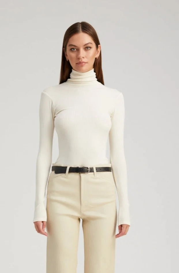 Our take on a classic long sleeve turtleneck cut in our signature Italian knit city jersey material for the softest and most flattering fit possible. Breathable and light weight, this is a great style for wearing with multiple layers. COLOR:Ecru PRODUCT DETAILS - 96% Viscose 4% Elastane - Dry clean only