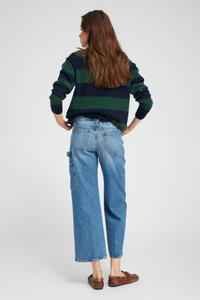 Our Cropped Carpenter jeans are a mid-rise relaxed fit designed to sit comfortably at the hips. Made from 100% Cotton for a classic denim look and feel, these jeans feature utility pockets and a hammer-loop detail. Featuring our signature V-back belt loop, and faux croc embossed label for a chic detail that accentuates your natural waistline. WASH: Edith - Medium Blue Stone Wash FIT & MEASUREMENTS - Fits true to size - Mid rise - Kennedy is 5'11" & wears size Small PRODUCT DETAILS - 100% Cotton - Non-Stretch Denim - Japanese Denim - Medium blue stone wash - Front zipper & button closure - Machine wash cold, tumble dry low