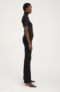 A timeless and versatile silhouette, our signature Micro Flare jeans feature a high rise with a slim fit and a narrow flare that extends past the ankle to elongate the legs. Made from stretch denim that conforms to your body and won't loose it's shape overtime, these pants will quickly become your favorite pair of jeans. Featuring our signature V-back belt loops and faux croc embossed label for a chic detail that accentuates your natural waist, wear these with a classic baby tee and sneakers or a button down and heels. WASH: Ella - Washed Black FIT & MEASUREMENTS - Runs small. For a tighter fit take your regular size - High-waisted - 35" inseam, 11.5" rise, 18.5" leg opening - Adama is 5'11 & wears size 26 - Toma wears size 26 PRODUCT DETAILS - 98% Cotton 2% Elastane - Stretch Denim - Italian Denim - Machine wash cold, tumble dry low - Front zipper & button closure