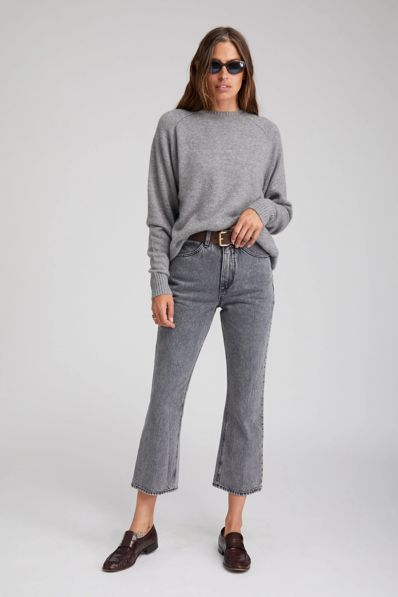 Our iconic Crop Flare jeans featuring our signature back V and chic faux embossed crocodile label. Enjoy the look of rigid denim with the comfort of stretch, perfectly cropped at the ankle to wear with any shoe. COLOR:Grey Stone Wash 98% cotton and 2% elastane - stretch Italian denim Inseam 27 1/2" Rise 11" Leg opening 16" Model wears size 26 PRODUCT DETAILS - 98% cotton and 2% elastane - Italian denim - Style runs 1/2 size big * - Inseam 27 1/2" - Rise 11" - Leg opening 16" - Model wears size 26