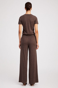 These fine-knit lightweight cashmere pants are a lounge favorite. This wide-leg silhouette features a high-rise elastic waistband that naturally cinches your waistline for a flattering fit you can wear all day long. Made in our high-quality, ultrasoft Mongolian yarn, you'll fall in love with these pants, as their elegant drape makes them look like a dress pant, but they feel like a sweatpant. Pair them with our matching cashmere tees or sweaters for the perfect elevated lounge look. COLOR: Heather Brown FIT & MEASUREMENTS - Relaxed fit - Toma wears size Small PRODUCT DETAILS - 100% Cashmere - Sustainably grown, organic yarn - Side slit pockets - Dry clean only