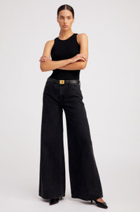 Our Wide Leg denim is a mid-rise style designed to sit relaxed at the waist, hips and thighs for an effortlessly chic and roomy, laid-back look. Featuring our signature back V and chic faux-croc embossed label, wear these with a cropped tank or leather tube top, or for a more casual look, with an oversized cashmere sweater. WASH: Jones - Faded Black FIT & MEASUREMENTS - Fits true to size - Mid-rise - Relaxed fit at the waist, hips, and thighs - Wide leg silhouette - Toma wears size 26 PRODUCT DETAILS - 100% Cotton - Non-Stretch Denim - Japanese Denim - Machine wash cold, tumble dry low - Front zipper & button closure