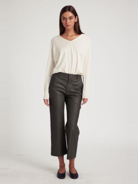 Our classic relaxed leather trouser silhouette - refined into a cropped fit. Designed with a comfortable low-risefit, functional pockets, and a zip closure with a snap button. This style is made to be worn slightlyoversized and can easily be worn casually with sneakersor dressed up with a heel. COLOR: Lavender FIT & MEASUREMENTS - Fits true to size - Mid-rise - Our lambskin gives naturally over time; if in-between sizes, size down - 26.5 inseam, 10 3/4" rise, 9 1/4" leg opening - Kiana is 5'11" & wears size Small PRODUCT DETAILS - 100% French Lambskin - Stretch Leather - Cotton-Lycra lining - Eco friendly, hypoallergenic and chrome-free vegetal dyed - 2 back welt pockets - Button front, zipper fly - Leather specialist clean only