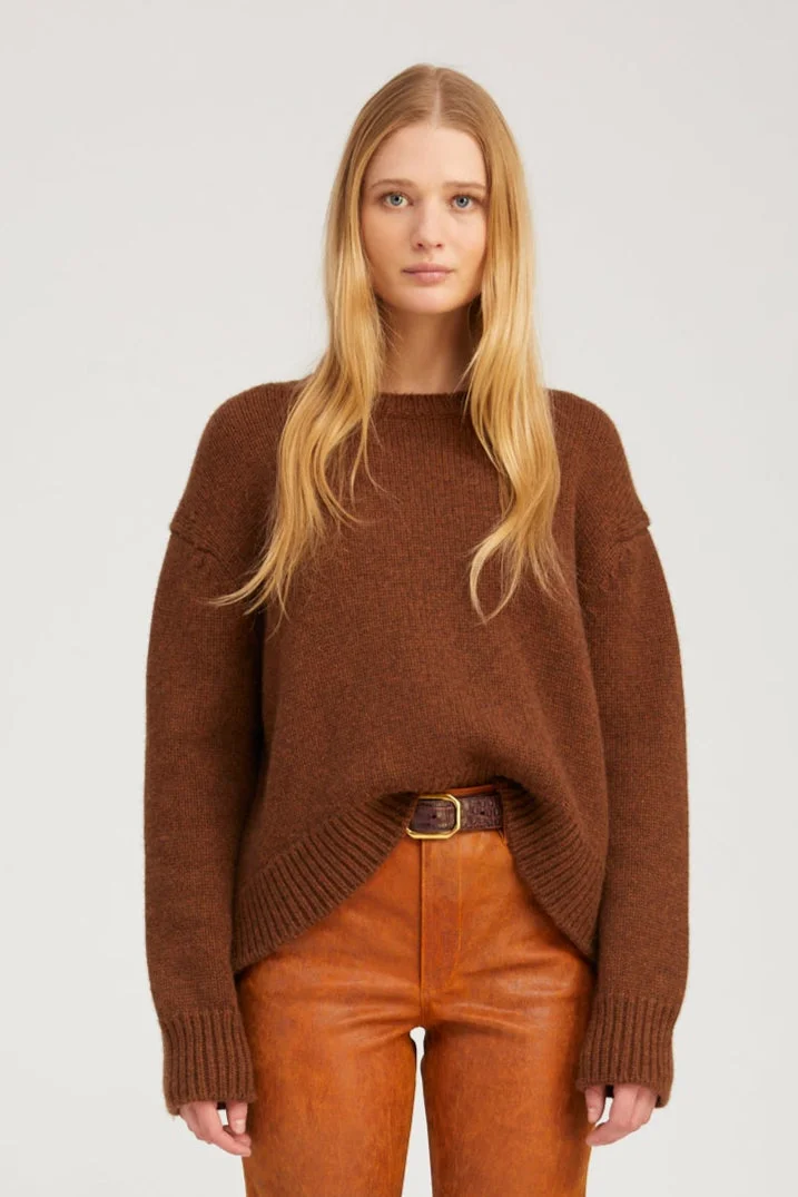 This luxe cashmere crewneck has a relaxed fit for the most elegant drape. Made from our high quality Mongolian yarn, this thick, double-weight fabric is ultra-soft and will keep you warm no matter what. With roomy shoulders and a hem that hits below your natural waist, it's the go-to sweater for both, casual and dressy looks. COLOR: Mace FIT & MEASUREMENTS - Fits true to size - Cropped fit - Emma is 5'10" & wears size Small PRODUCT DETAILS - 100% Cashmere - 3 gg - Sustainably grown, organic yarn - Dry clean only