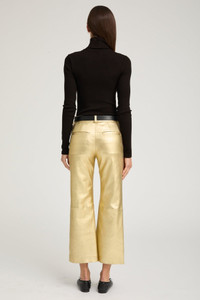 A luxurious cropped take on our classic trouser, made in our buttery-soft, stretch-leather. An effortlessly chic and easy to wear relaxed-fit that sits below the waist; featuring 2 functional pockets and a concealed zip for a sleek and timeless look. With a wide range of styling options, wear these casually with loafers and a cashmere sweater, or dressed up with heels and a turtleneck. COLOR: Metallic Gold FIT & MEASUREMENTS - Fits true to size - Mid-rise - Our lambskin gives naturally over time; if in-between sizes, size down - 26.5" inseam, 10 3/4" rise, 9 1/4" leg opening - Anna is 5'11 & wears size Small PRODUCT DETAILS - 100% French Lambskin - Stretch Leather - Cotton-Lycra lining - Eco friendly, hypoallergenic and chrome-free vegetal dyed - Button front, zipper fly - 2 back welt pockets - Leather specialist clean only