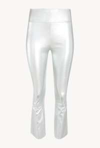 Our buttery-soft Ankle Flare Leggings feature a skin-tight fit with a subtle kick-flare at the ankle for a naturally elongating look. Made from our plonge stretch-leather, these pants feel like a second-skin due to their extreme breathability technology, which provides maximum mobility and comfort, while regulating your temperature all year round, so they'll be the first leather pants you can wear in the summer without overheating. Fit with our signature high-waisted Japanese elastic waistband, which provide a figure-sculpting fit that conform to your body-- another reason these pants will become your forever-favorite. COLOR: Metallic Silver FIT & MEASUREMENTS - Fits true to size - Meant to fit tight at first-try - leather naturally gives; if in between sizes, size down - High-rise, skinny fit - 28" inseam, 8" leg opening, 3 3/8" waistband depth PRODUCT DETAILS - 100% French Lambskin - Stretch Leather - Cotton-Lycra lining - Elastic waistband, pull-on fit - Eco friendly, hypoallergenic and chrome-free vegetal dyed - Leather specialist clean only