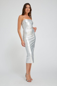 An ever-popular silhouette, our sleek leather tube dress is hand-tailored to ensure the perfect figure-sculpting fit. Made from our signature stretchy French plonge leather, this chic, curve-skimming style has a strapless, straight neckline for a classic and elegant look. COLOR: Metallic Silver FIT & MEASUREMENTS - Fits true to size - Meant to fit tight at first-try – leather naturally gives; if in between sizes, size down - 42" length, 11 1/4" back slit - Kennedy is 5'11" & wears size Small PRODUCT DETAILS - 100% French Lambskin - Stretch Leather - Cotton-Lycra lining - Eco friendly, hypoallergenic and chrome-free vegetal dyed - Invisible back zipper, hook & eye closure - Hand-tailored for a figure-sculpting fit - Leather specialist clean only
