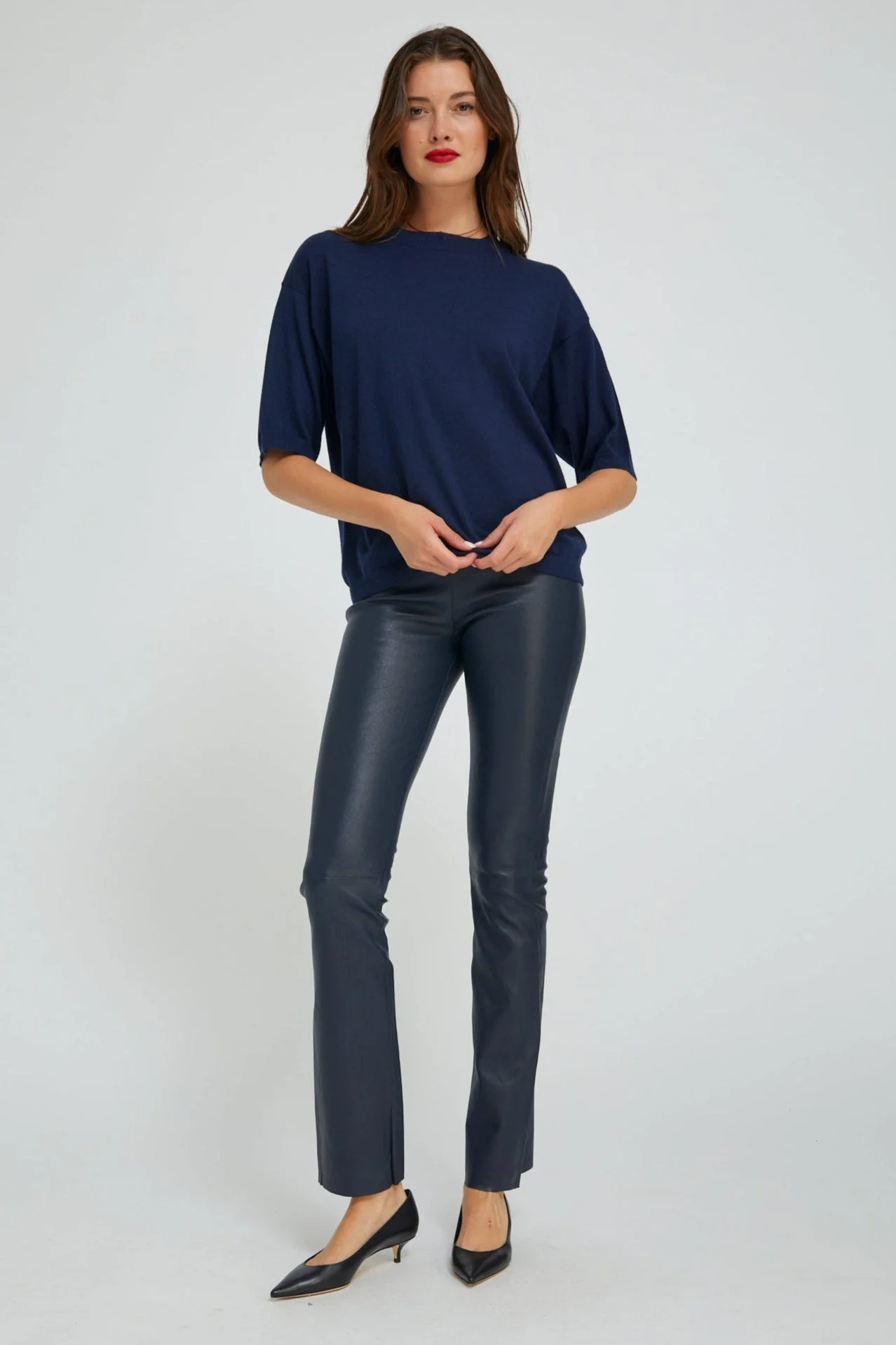 Our classic Micro Flare Leather Pant will quickly become an essential, and fun, part of your wardrobe. Featuring a tight fit from waist to mid-calf that flares out slightly past the ankle for an elongating look, these are perfect for those who want a slimming and comfortable fit with some added flare. Made from our stretchy French plonge leather, these pants feel like a second-skin with their extreme breathability – a property exclusive to SPRWMN – and can be worn year-round. COLOR: Midnight FIT & MEASUREMENTS - Fits true to size - Meant to fit tight at first-try – leather naturally gives; if in between sizes, size down - High-rise, slim fit - 34" inseam, 8.7" leg opening, 10.5" rise, 3 3/8" waistband depth - Kennedy is 5'11 & wears size Small PRODUCT DETAILS - 100% French Lambskin - Stretch Leather - Cotton-Lycra lining - Elastic waistband, pull-on fit - Eco friendly, hypoallergenic and chrome-free vegetal dyed - Leather specialist clean only