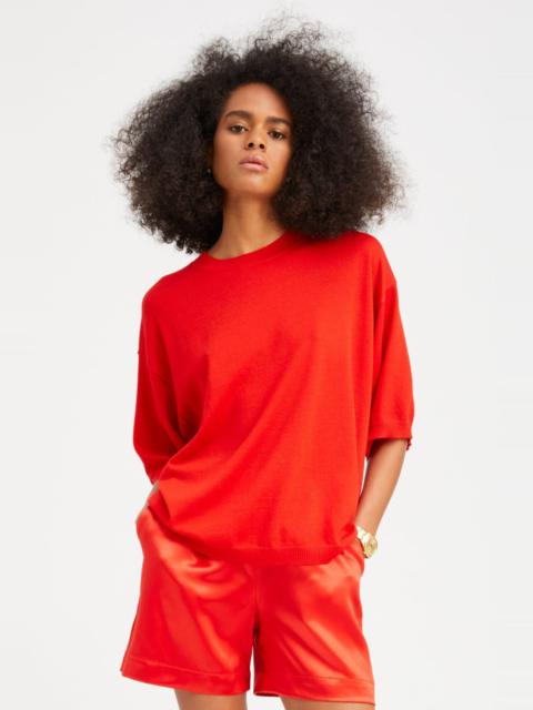 Knitted in our high quality, thin ribbed ultra-soft Mongolian Cashmere, this boxy tee will easily become your new favorite go-to. Elegantly designed for everyday wear, this slightly oversized tee has just the right amount of stretch. With a wide range of styling options, tuck this top into your favorite high waisted bottoms, or wear undone for the perfect laid-back look. COLOR: Navy FIT & MEASUREMENTS - Oversized fit - Kennedy is 5'11" & wears size Small PRODUCT DETAILS - 100% Cashmere - Sustainably grown, organic yarn - Lightweight - Room for layering - Dry clean only
