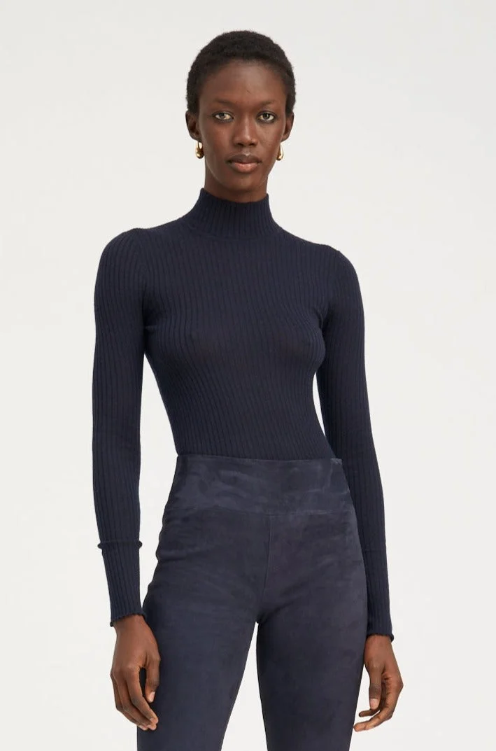 Finely knitted in our high quality, ultra-soft Mongolian Cashmere, this lightweight long sleeve essential will easily become a wardrobe favorite. Elegantly designed with playful lettuce hemlines, this vertical ribbed mock-neck has just the right amount of stretch, and is slightly fitted for a slimming look. With a wide range of styling options, this top tucks seamlessly into all of your high waisted bottoms making it the perfect layering piece to pair with your favorite SPRWMN jeans or trousers. COLOR:Inkwell - Deep Navy FIT & MEASUREMENTS - Fits true to size - Model wears a size small PRODUCT DETAILS - 100% Cashmere - Sustainably grown, organic yarn - Mock neck - Dry clean only