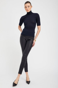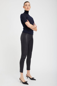 Our classic Ankle Leggings, made in our signature stretchy French plonge leather, feel like a second-skin due to their extreme breathability – a property exclusive to SPRWMN – are a wardrobe essential that can be worn every single season. These pants also feature our signature Japanese elastic waistband for a figure-sculpting fit. Style them casually with slides and a tee, or dress them up with heels and a leather tube top. COLOR: Navy FIT & MEASUREMENTS - Fits true to size - Meant to fit tight at first-try – leather naturally gives; if in between sizes, size down - High-rise, skinny fit - 28.5" inseam - Model wears size Small PRODUCT DETAILS - 100% French Lambskin - Stretch Leather - Cotton-Lycra lining - Elastic waistband, pull-on fit - Eco friendly, hypoallergenic and chrome-free vegetal dyed - Leather specialist clean only