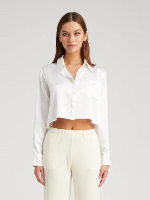 For a more feminine take on classic workwear, this timeless button down is made in a Sateen Silk adding a bit of texture and luxury to your outfit. Designed to fall below the natural waist, this silhouette perfectly meets all high waisted bottoms for a clean look - without the hassle of a tuck. With virtually endless styling options, this top pairs well with everything from denim to trousers. COLOR: Navy FIT & MEASUREMENTS - Fits true to size - Cropped fit - Anna is 5'11 & wears size Small PRODUCT DETAILS - 100% Silk - Dry clean only