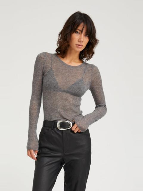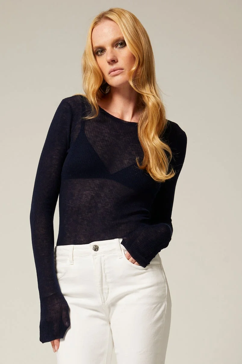 Our classic long sleeve baby tee, but made from our featherweight ribbed Tissue Cashmere, which enhances its elegant drape and flattering silhouette. Knitted from our ultra-soft Mongolian yarn, this closet essential has an easy crew neckline and is designed for a slightly loose fit, making it the perfect everyday go-to. COLOR: Navy FIT & MEASUREMENTS - Fits true to size - Model wears size Small PRODUCT DETAILS - 100% Cashmere - Sustainably grown, organic yarn - Ultra lightweight - Room for layering - Dry clean only